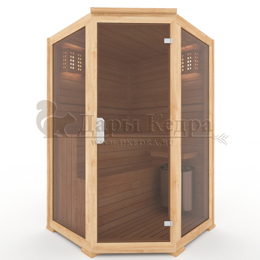Это специально оборудованная деревянная кабина для сухого и влажного парения. Электропечь нагревает пространство внутри и позволяет сбрызгивать камни водой, слегка увлажняя воздух. Такая процедура позволяет избежать перегрева. Сауна обшита снаружи и внутри вагонкой из липы и имеет теплоизоляционный слой. Установка сауны в угол позволяет рационально использовать пространство помещения. Финская сауна с электропечью подойдет как для домашнего использования, так и для коммерции. Доставляется в разборном виде щитами, собирается по инструкции с помощью шуруповёрта.