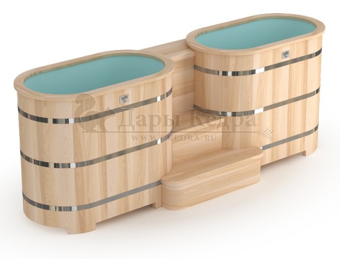 Купель представляет собой две овальные емкости для воды с пластиковыми вставками, в которых люди отдыхают после парения. Между купелями установлен широкий подиум из кедра, по которому могут спускаться и подниматься сразу несколько человек. Для комфортного отдыха купель оснащена лавочками и двумя внутренними лестницами.