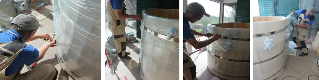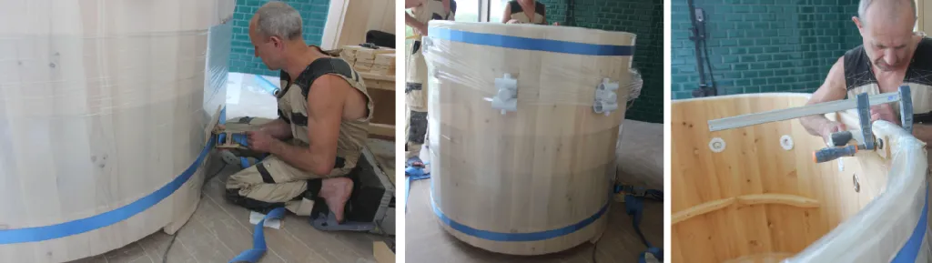 8. Оставить купель до полного высыхания на 3 часа. После этого необходимо снять стяжные фиксирующие ремни и пленку. В местах склейки внутри и снаружи при необходимости убрать концелярским ножом остатки клея PUR, зашлифовать и нанести защитное покрытие, если изначально им была пропитана купель. И далее снова нанести пленку на изделие.